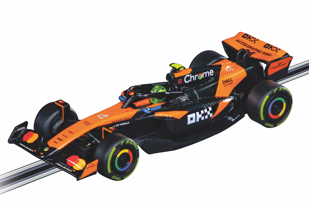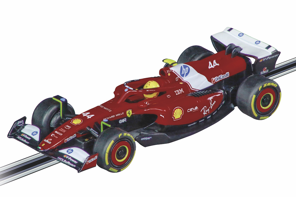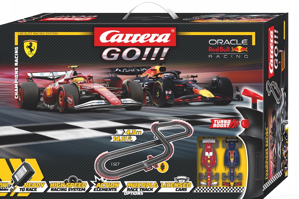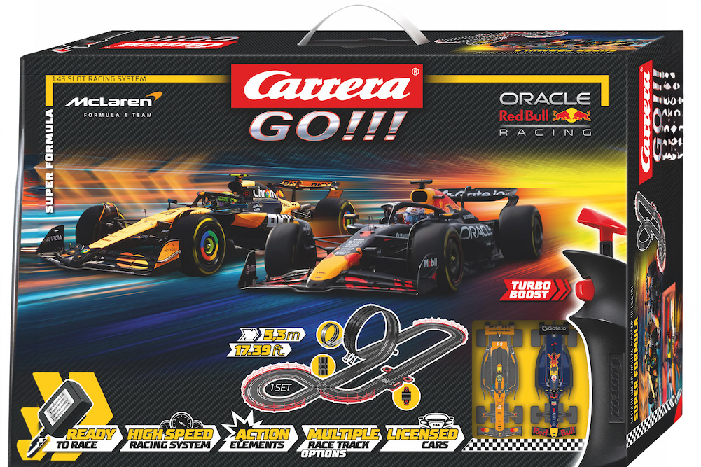 Ein besonderes Highlight: Erstmals enthalten die Carrera-Sets Formel-1-Boliden mit dem aktuellen Line-up der Formel 1 2025: den Oracle Red Bull Racing RB 21 „M. Verstappen, No.01“, den McLaren „L. Norris, No.4“, den Ferrari SF-25 „L. Hamilton, No.44“, den Mercedes-AMG F1 W14 E Performance „G. Russell, No.63“ oder den Mercedes-AMG F1 „K. Antonelli, No.12“. Mit den Turbo-Handreglern holen die Piloten das Maximum aus ihren Maschinen heraus und fliegen mit Höchstgeschwindigkeit über die Rennstrecke. Jeder Moment auf dieser Bahn ist ein echtes Formel-1-Erlebnis, bei dem es nur um eines geht: Wer bleibt cool und behält die Führung?