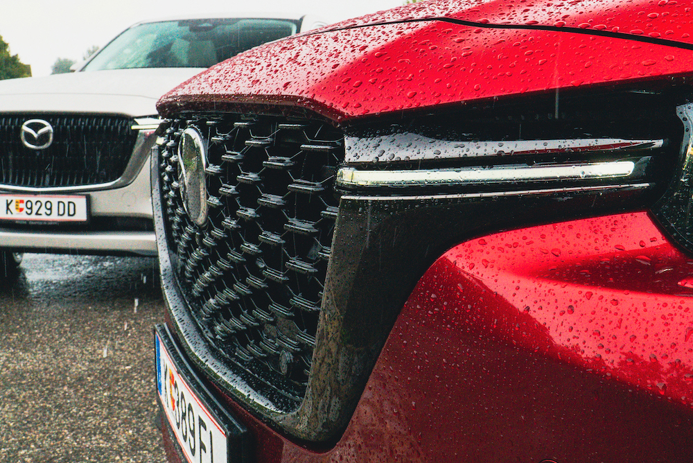 Direkt daneben kann das Platinum Quartz des Diesel-CX-60 doch weit weniger Aufsehen erregen. Für meinen Geschmack wurde da ein wenig zu viel Champagner beigemengt. Bitte nicht falsch verstehen, der CX-60 an sich bleibt ein wunderschönes Auto und die vielen Chrom-Applikationen der Takumi Plus-Version passen richtig gut zum edlen Äußeren des mächtigen SUV, aber die rote Version wirkt mit der Kühlereinfassung und den Türrahmen in Schwarz einfach sportlicher und insgesamt stimmiger.