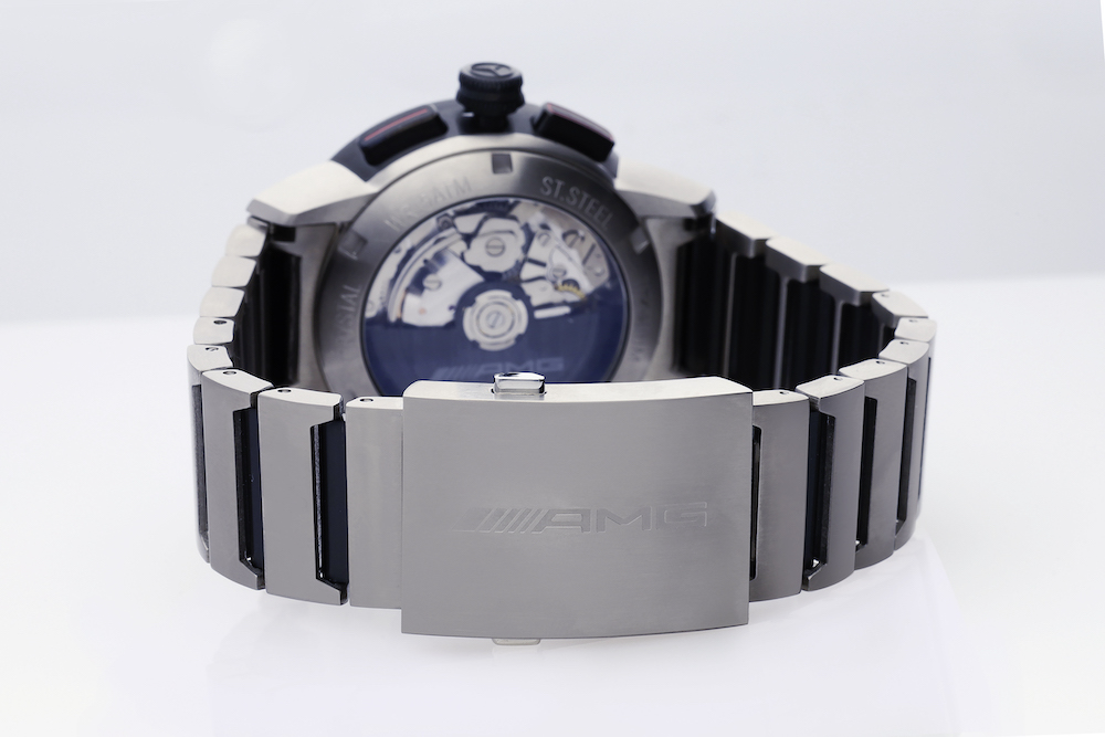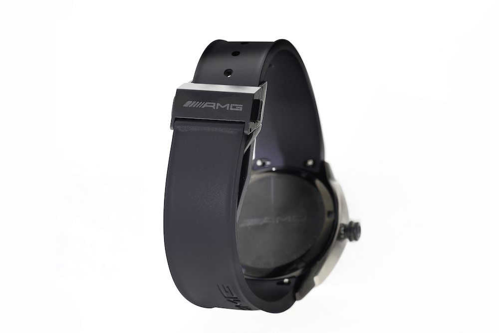 Die „sportliche Armbanduhr“ ist Ausdruck purer Performance. Im Inneren schlägt, mit ausgelagerter Sekunde, das Schweizer Quarzwerk Ronda 6004. Der Quarzantrieb steht für absolute Präzision. Das Gehäuse ist ein an die AMG Designsprache angelehntes Meisterstück: mehrteilig konstruiert, mit überspannten Flächen und einer markanten Verjüngung, die an das aerodynamische Heck des Vision AMG erinnert. Titan als Obermaterial sorgt für Leichtigkeit und Robustheit, während das schwarze Edelstahlmittelteil ein wertiges Tragegefühl vermittelt.