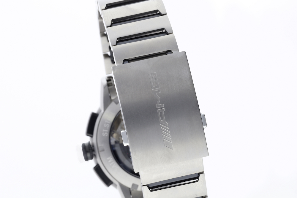 Der „Chronograph“ wurde für Menschen entwickelt, die Zeit nicht nur messen, sondern meistern wollen. Angetrieben wird er vom Schweizer Quarzwerk Ronda 5030 mit präziser Stoppfunktion. Die Gehäuseform folgt ebenfalls der AMG-Formsprache mit ihrem mehrteiligen Aufbau und der Materialkombination aus leichtem Titan und Edelstahl. Das Ergebnis: ein hochwertiges Tragegefühl. Funktionales Highlight ist die matt-schwarze Lünette aus Keramik mit einer weiß ausgelegten Tachymeterskala.