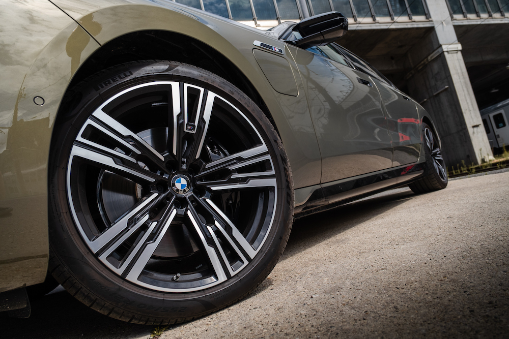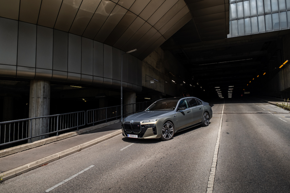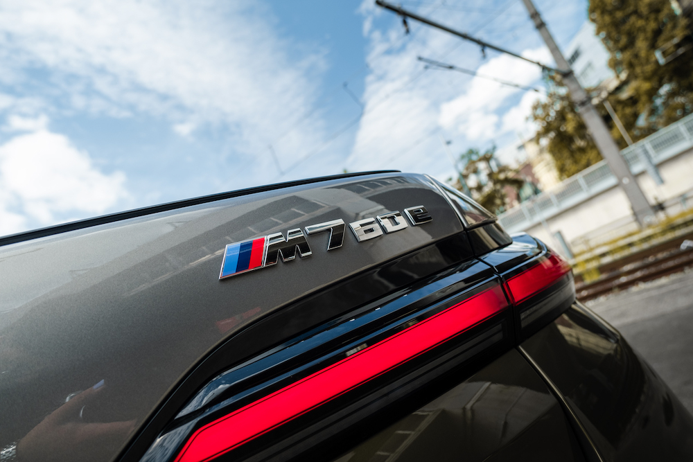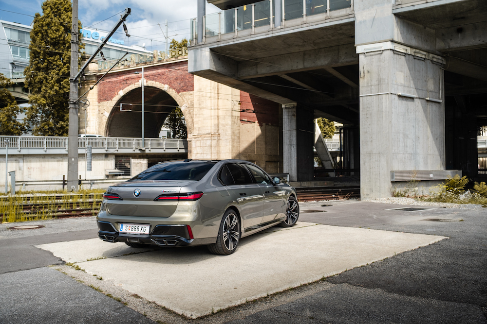 Selbst wenn man die aktuelle Generation des 7er BMW als fahrende Burg bezeichnet, wird man der imposanten Masse des Fahrzeuges nicht gerecht. Die Front, Seitenwände und selbst das Heck bauen bis in den Himmel hoch auf und schaffen es dank der Länge des Fahrzeuges trotzdem, eine schön proportionierte Limousinen-Silhouette zu zaubern. Die serienmäßige M-Ausstattung des M760e verleiht dem Münchner noch mehr Präsenz auf der Straße und untermalt mit schwarzen Akzenten die zweifarbige Lackierung unseres Testwagens. Die Position als Spitzenmodell sieht man dem M760e nur an ein paar M-Logos, der Modellbezeichnung und den zweiflutigen Endrohrblenden an.