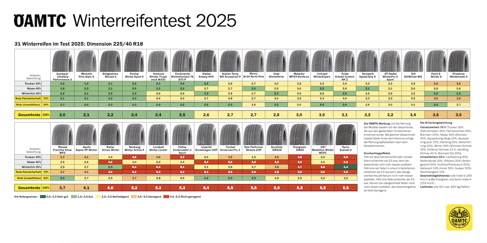 Der ÖAMTC hat gemeinsam mit Partnerorganisationen 31 Winterreifen der Dimension 225/40 R18 getestet, die vor allem bei Fahrzeugen der unteren Mittelklasse immer beliebter wird. Das Ergebnis offenbart deutliche Unterschiede zwischen den Preisklassen: Während alle sechs Premium-Reifen mit der Note „gut“ abschlossen, erhielten elf Modelle – ausschließlich aus dem Budget-Segment – die Bewertung „nicht genügend“.