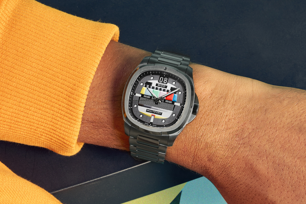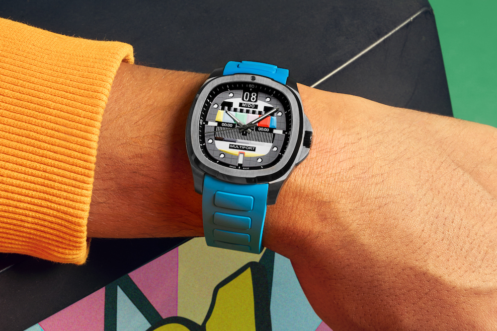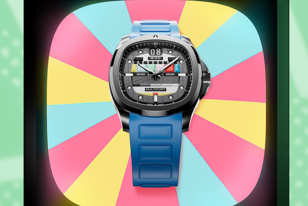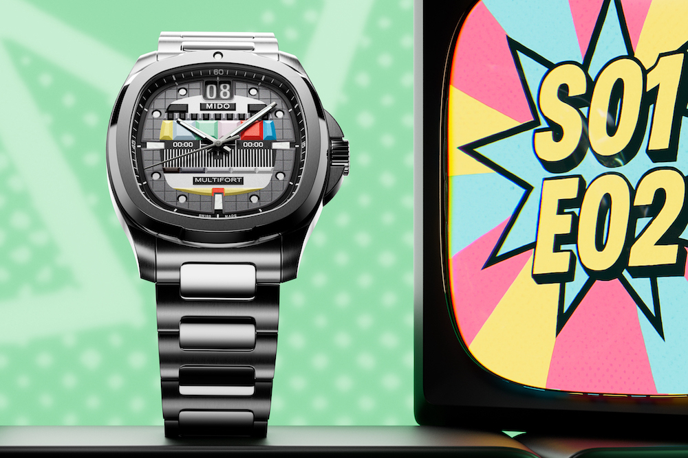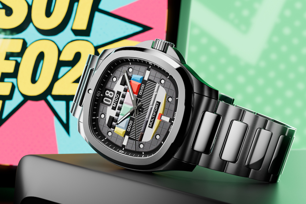 Mido präsentiert die zweite Folge seiner Kultserie, die Multifort TV Big Date S01E02. Inspiriert vom goldenen Zeitalter des Fernsehens zeigt diese Sonderedition ein Zifferblatt mit geprägten Farbstreifen, wie sie auf alten Fernsehgeräten zu sehen waren.