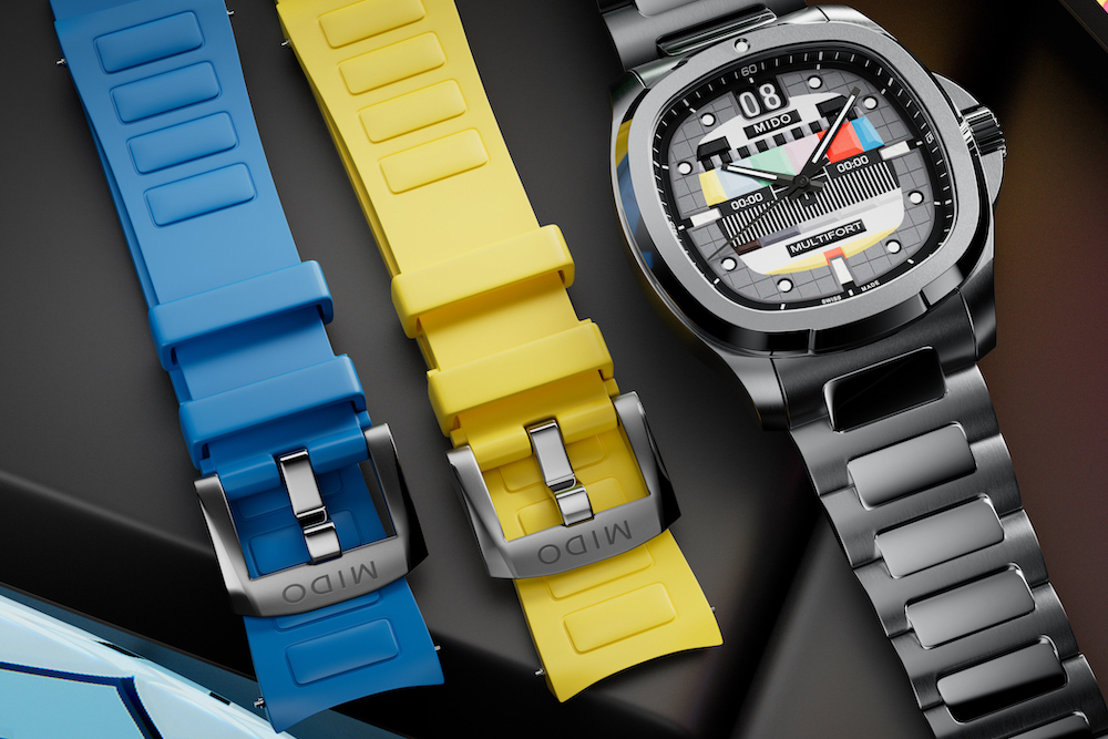 Das zentrale Reliefmotiv erinnert an die Farbtestbilder alter Fernseher. Die Schriftzüge „MIDO“ und „Multifort“ sind originell in das Design integriert. Der graue Rahmen hebt die Leuchtkraft der Farben hervor. Ein markantes Merkmal der Kollektion sind die vertieften Indizes, die mit weißem Super-LumiNova gefüllt sind. Das Großdatum setzt ein klares Statement, weiß auf schwarzem Hintergrund, und findet sich auch auf der Lünette mit weißer Minuterie wieder.