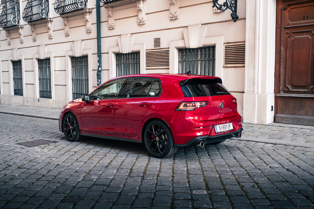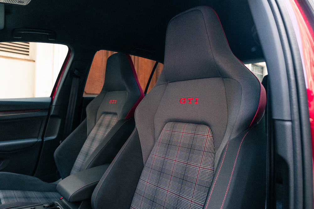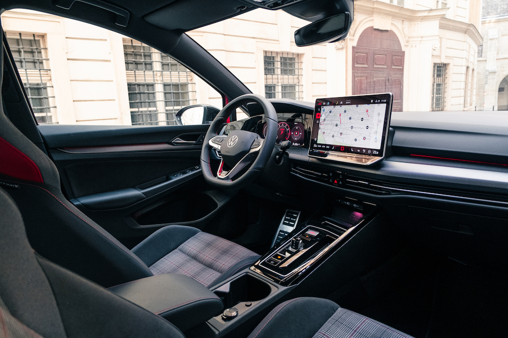 Die etwas verbreiterten Seitenschweller gehen in Heckansätze über, welche dann in einem angedeuteten Diffusor münden. Weiteres finden wir am Heck die zwei großzügig dimensionierten Endrohre der Abgasanlage, die dem GTI das nötige Sprachrohr verschafft. Nutzer dieses Sprachrohrs ist der zwei Liter große Vierzylinder-Turbomotor unter der “Kings Red” lackierten Motorhaube. Dieser produziert 265 PS und 370 Nm Drehmoment, die den Golf in 5,9 Sekunden auf 100 km/h katapultieren.