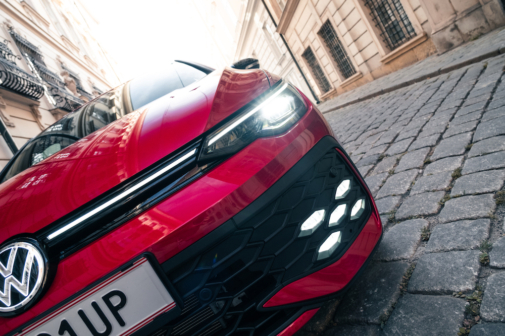 seit acht Generationen vereint der Golf GTI Sportlichkeit mit Alltagstauglichkeit, was bedeutet, dass es für die neueste Reinkarnation große Fußstapfen zu füllen gibt. Auf dem Weg nach Rijeka, Kroatien, habe ich dem Wolfsburger mal auf den Zahn gefühlt und versucht, die Faszination GTI zu verinnerlichen. Optisch hat der 8er Golf nicht unbedingt abgesahnt, doch mit dem Facelift und der etwas schärferen Front ist aus dem hässlichen Entlein ein ansehnlicher Schwan geworden. Der GTI ist klar vom regulären Golf unterscheidbar und bekommt eine eigene Frontschürze mit sehr markanten Nebelscheinwerfern, wie es der 7er schon vorgemacht hat. Über den Nebelleuchten sitzen die Scheinwerfer, die von einem Leuchtband und dem beleuchteten VW-Logo verbunden werden.
